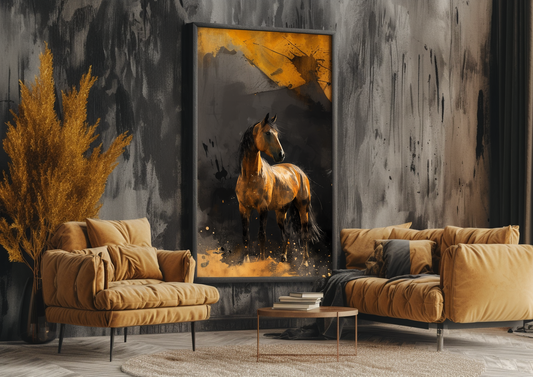 A printable Copy of a Golden Brown Horse, Abstract Painting, Black Background, Equestrian Decor