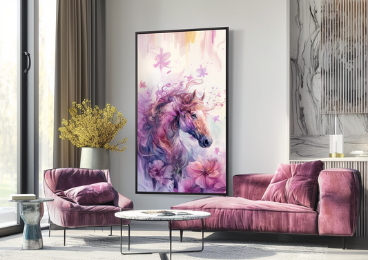 A Printable Copy of a Contemporary Horse Art, Abstract Equestrian Decor With a Touch of Spring Flower Blossom